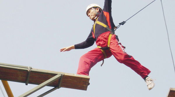 高空讓人們產生一種恐懼、恐慌感,項目利用這種心里承受的極限把每個人的潛在能力激發出來,該項目包括空中單杠拓展初體驗讓學員感覺到其實自己可以完 成看似不可能完成的任務,承認自己的能力和存在的價值。同時在項目中,體會同伴的鼓勵與激勵的重要性,只有絕對的自信與他信才能使你走向成功。